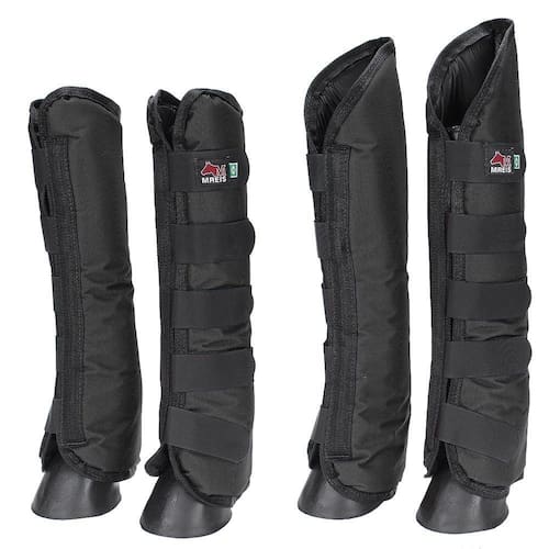Protetor de viagem Mreis, utilizado para proteger o joelho / jarrete, canela, machinho, quartela e cascos durante o transporte. Fabricado em nylon cor Preta, com proteção interna de espuma e fechamento em tira autocolante. Jogo com 4 peças: 2 dianteiros e 2 traseiros.