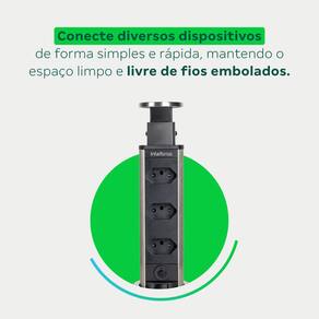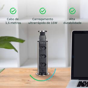 • Mesa mais organizada: Elimina fios aparentes e otimiza o espaço, proporcionando um ambiente limpo, moderno e com design minimalista. • Conexão rápida e prática: Design ergonômico que facilita o uso, eliminando a necessidade de extensões ou lidar com aqueles emaranhados de fios. • Instalação com acabamento profissional: Projetada para ser embutida no móvel, requer furação com serra copo de 60 mm e conhecimento técnico para garantir encaixe perfeito. O resultado é um acabamento discreto em inox que valoriza o ambiente. • Durabilidade e segurança: Resistente a danos e ao desgaste, oferece proteção contra sobrecarga, curto-circuito e choques elétricos, protegendo os dispositivos conectados. • Certificação garantida: todos os protetores eletrônicos Intelbras são testados e aprovados pelo Inmetro, assegurando maior confiabilidade e segurança.