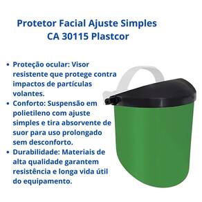 Protetor Facial Ajuste Simples CA 30115 Plastcor Proteção Eficiente para Atividades O Protetor Facial Ajuste Simples Verde CA 30115 da Plastcor é um equipamento de proteção individual desenvolvido para proteger os olhos contra impactos de partículas volantes em atividades que não geram radiação infravermelha. Composto por um visor incolor de 8 polegadas em policarbonato, testeira em polipropileno, suspensão em polietileno com ajuste simples e uma tira absorvente de suor, oferece conforto e segurança durante seu uso.