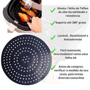 Atenção para a descrição do produto: manta teflon para airfryer fritadeira elétrica . A manta de teflon possui espessura de uma folha A4, porém muito resistente a altas temperaturas. A gente sabe que você procura funcionalidade na hora de preparar seus alimentos, além de facilitar muito a limpeza é super fácil de lavar. É reutilizável, lavável e não transmite odor e sabor aos alimentos. Suporte resistente até 260º. Antiaderente, evita que os alimentos grude no seu cesto.