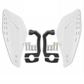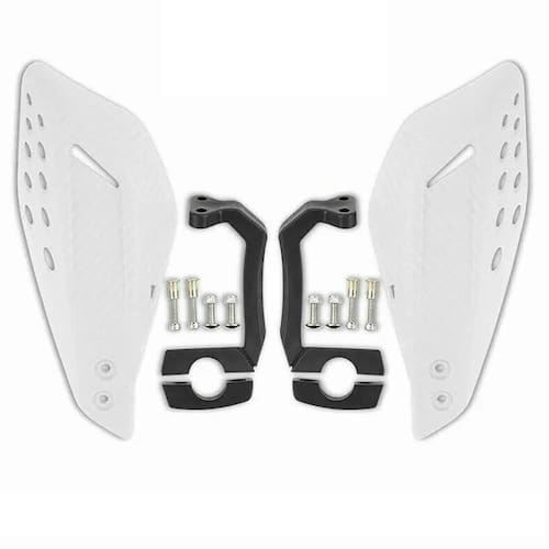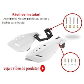 Contem: - 02 protetores de mãos na cor branco duas peças ; - 02 suportes para fixação no guidão duas peças ; Todos os parafusos, porcas e buchas para instalação acompanham no kit.