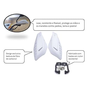 Características e benefícios: - fabricado com hastes em nylon, textura de fibra de carbono, design exclusivo, leve, resistente e flexível, protege as mãos e os manetes contra pedras, lama e poeira; - caso precise retirar o manete, não será necessário retirar o protetor de mão; - o protetor na cor branco pode ser instalado em motocicletas com freio dianteiro à disco ou tambor, com todos os tipos de guidão; - produto elaborado com material de alta qualidade, testado e aprovado dentro das normas de segurança; - este produto é de fácil instalação, não exige que mude a estrutura de sua moto, para encaixe e funcionamento perfeito.
