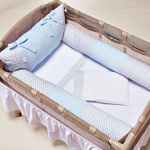 Protetor Para Berço Desmontável 3 Peças Chevron Azul Claro Conheça agora nosso Kit de protetores para Berço Desmontável camping ou chiqueirinho 3 Peças. Com estampas Lindas pra dar um toque especial no seu bercinho. CONTÉM: - 02 rolos protetores de laterais 85cm x 15cm - 01 cabeceira 60cm x 33xm COMPOSIÇÃO Tecido 100% algodão. Enchimento 100% poliéster.