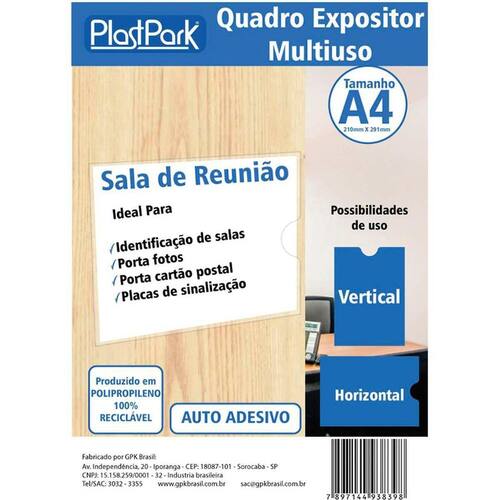 Quadro Expositor Multiuso No Tamanho A4. Display Em Polipropileno Cristal E Auto Adesivo, Ideal Para Expor Avisos, Comunicados E Identificação De Salas, Pode Ser Fixado Em Hospitais, Elevadores, Recepções, Indústrias, Condomínios, Quadro De Avisos Enre Outros Lugares. Marca: Não Informado Ean: 7897144938398