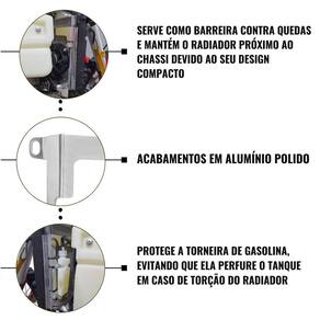 Fabricado em chapa de alumínio naval 3mm, ele não só resiste a pancadas de pedras e danos nas colmeias, mas também serve como primeira barreira contra quedas laterais, graças ao seu design envolvente que abraça o radiador.