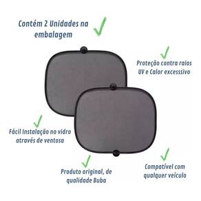 - Kit: 02 protetores solar e 02 ventosas cada - Material: Ventosa - 100% PU - Rede: 100% Poliéster - Borda do Protetor: 100% Fio de aço - Cor: preto, liso - Ajustável: com ventosa - Tamanho: 44x36cm - Compatível: Qualquer modelo de carro