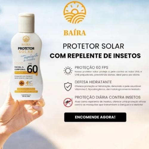 O protetor Solar Baíra com repelente de insetos, repele a ação de mosquitos como Aedes Aegypti transmissor da dengue , Anopheles p. transmissor da malária e Culex quinquefaciatus transmissor da filariose . Protege a pele dos efeitos nocivos da radiação UVA e UVB. O protetor Solar Baíra com repelente é indicado para o uso onde há exposição ao ataque de insetos ou radiações ultravioletas.