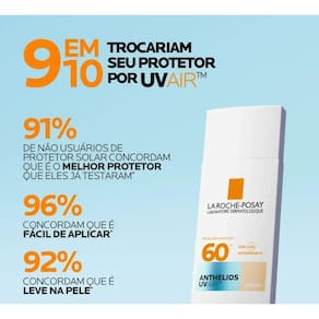 Protetor Solar Facial La Roche-Posay Anthelios UVAir FPS 60 Altura 6 Largura 11 Comprimento 16 Protetor Solar Facial La Roche-Posay Anthelios UVAir FPS 60br / Cor 4.0 com 45ml br / Br / O Anthelios UVAir FPS 60 com Cor é o protetor solar facialbr / Da La Roche-Posay desenvolvido especialmente para o clima brasileiro. Sua fórmulabr / Ultraleve, 10x mais leve que protetores comuns, garante alta proteção contra osbr / Br / Enriquecido com Ácido Hialurônico e Niacinamida, hidratabr / Intensamente e contribui para o cuidado da pele por até 24 horas. Ideal parabr / Uso diário, é indicado para todos os tipos de pele, principalmente as oleosas,br / Pois ajuda a controlar a oleosidade por até 16 horas, proporcionando efeitobr / Br / Benefícios e diferenciaisbr / Br / Br / Protetorbr / Solar facial com cor e FPS 60 de muito alta proteção.Br / Texturabr / Contémbr / Oil-free,br / Açãobr / Altabr / Aceitação sensorial: 9 em cada 10 consumidores preferem em relação aobr / Br / Br / Como usarbr / Br / Aplique o Anthelios UVAir FPS 60 com Cor em quantidadebr / Generosa sobre a pele limpa e seca, aproximadamente 30 minutos antes dabr / Reaplique sempre após suor intenso, natação, secagem com toalha ou exposiçãobr / Prolongada. Quantidades insuficientes reduzem a eficácia da proteção.Br / Br / Advertênciasbr / Br / Br / Usobr / Evitebr / Interrompabr / Obr / Produto auxilia na prevenção de queimaduras solares, mas não protegebr / Contra insolação.Br / Evitebr / Armazenebr / Marca: Não Informado Ean: 7908785488996