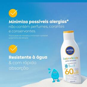 NIVEA SUN Protetor Solar Kids & Babies Pele Sensível FPS 60 é um protetor solar especialmente desenvolvido para crianças e bebês a partir de 6 meses.