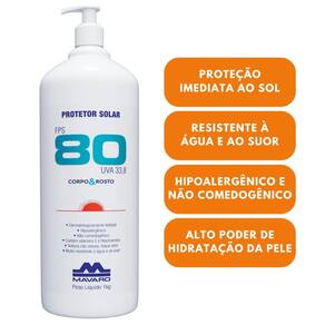 O Protetor Solar FPS 80 Corpo E Rosto possui eficaz proteção contra as radiações UVA e UVB.