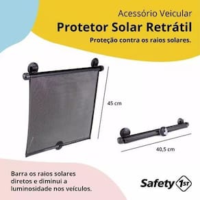 Protetor Solar Retrátil Infantil Carro Safety 1St Dias quentes e ensolarados são um convite para passeios, mas ao transportar as crianças no carro, precisamos ter toda atenção e cuidado com todos os detalhes. Para isso o Protetor Solar Retrátil da Safety 1st é um acessório indispensável. Fácil de instalar, basta pressionar as ventosas no vidro e com seu botão para retração rápida, recolha quando quiser, sem precisar desinstalar o produto. Para proteção da incidência direta dos raios solares ou mesmo para reduzir o excesso de luminosidade durante aquela agradável soneca, o Protetor Solar Retrátil Safety 1st estará sempre à mão.