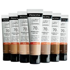 Protetor solar com cor, cobertura de base, fluido, antioleosidade com 14,5% de filtros UV e 5% de niacinamida, FPS 70, toque seco e eficácia contra raios UVA e UVB.