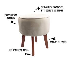 Puff com forma redonda; Estrutura em madeira de pinus, garante maior resistência e durabilidade ao produto; Seu revestimento em camurça, com um toque aveludado. Espuma d26 de3 cm de espessura em cima e 1 cm na lateral; 04 pés, de alta resistência; Você vai adquirir produto montado. Conteúdo da embalagem: 1 puff de 4 pés.
