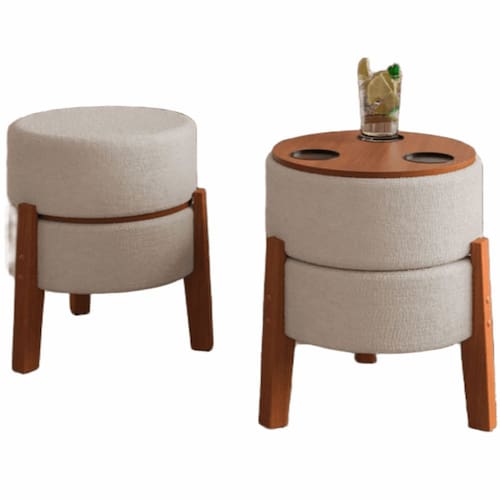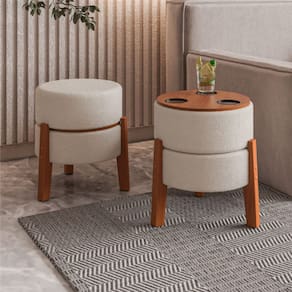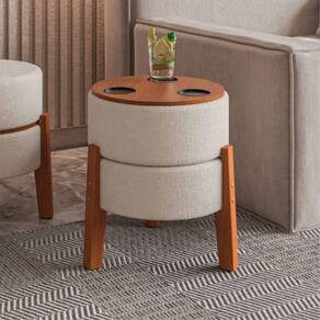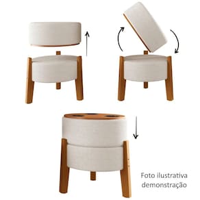 Estrutura: Madeira de ReflorestamentoRevestimento: Tecido LinhoTampo: MDF com porta-coposForma: RedondoSuporta: Peso de 120 KilosPés: Pés de madeira maciça com sapata anti-umidade Diferencial: Pode ser utilizado como assento e girando pode ser utilizado com porta-copos.Dimensões do produto montado