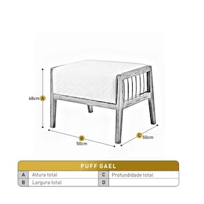 Verificar dimensões para acesso ao local de uso Ambiente Principal: Sala de Estar Cor: Cinza Cor do Produto: Cinza Escala de Brilho: Fosco Itens Inclusos: 1 Puff Gael Linha ou Coleção: Gael Material da Estrutura: Madeira Eucalipto Material dos Pés: Madeira Maciça Necessita Montagem: Não Peso: 9 kg Possui Baú: Não Possui Pés: 04 Possui Rodízio: Não Recomendações de Uso, Manutenção e Limpeza: Utilizar um pano levemente umedecido, seguido de pano seco.Evitar exposição ao sol, para que não sofra alterações na cor do tecido.Não limpar com escovas ou semelhantes. Suporta Até (kg): 120 kg