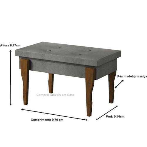 dimensões do produto montado altura: 0,47 cm comprimento: 0,70 cm profundidade: 0,40 cm caracteristicas produzido em madeira pés de madeira maciça tecido suede com captone suporta até 80kg montagem: este produto acompanha kit de montagem de parafusos para fixação dos pés. Atenção: a montagem não é oferecida pela comprar moveis em casa, a montagem do produto é por conta do comprador. Observações importantes: o produto é lacrado e novo com embalagem. A garantia é de 90 dias por defeitos de fabricação. Se no ato de recebimento do produto o cliente verificar que o produto não está em prefeito estado, principalmente por ocasião de transporte irregular, o cliente deverá recusar o recebimento do produto e entrar em contato para resolver o problema. Podem haver variações referentes à tonalidade das cores expressas nas fotos, por conta de fatores como iluminação e brilho de cada monitor/celular. Fotos meramente ilustrativas, não acompanham os produtos de decoração. Se atente a politica de troca/devolução da empresa.