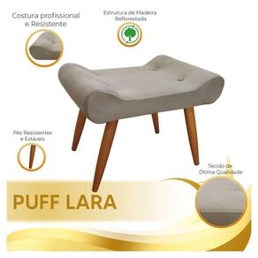 Diferenciais do Puff: Estrutura: fabricado com Madeira Eucalipto Reflorestada, Assento: Espuma D-12 Material dos Pes: Pes Palitos em Madeira trabalhada, levemente inclinados Possui 4 pes de madeira pinus de 30 cm, estilo retro (palito); Design exclusivo no assento; Revestimento em Sued de otima qualidade; Puff firme e estavel.