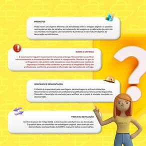 Limpeza e cuidados: Utilizar pano levemente umedecido com água, seguido de pano seco. Não utilizar produtos químicos ou abrasivos na limpeza. Evitar contato com objetos cortantes. Manter ao abrigo de local interno, sem ficar exposto diretamente ao sol, calor e umidade excessivo.