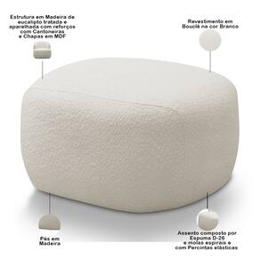 Características: Estrutura em madeira de eucalipto tratada e aparelhada com reforços, cantoneiras e chapas em MDF. Revestimento em tecido Bouclê de alta qualidade na cor Branco. Assento composto por espuma D-26 e molas espirais. Percintas elásticas para maior resistência e durabilidade. Pés em madeira. Peso suportado: Até 120 kg.