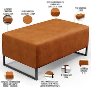 Color: Laranja | ColorFamily: Laranja | ColorSimple: Laranja | ColorSupplier: Canela | MaterialFamily: Madeira, Base de ferro, Couro sintético e espuma | Model: Cléo | OriginCountry: Brasil | OriginState: PR | ProductContents: 01 Puff | ProductHeight: 42 cm | ProductInstructions: Produto para uso em ambiente interno, nao devendo ficar exposto ao sol, calor e umidade excessivos. | ProductLength: 46 cm | ProductWarranty: 90 dias após o recebimento do produto | ProductWeight: 8,5 kg | ProductWidth: 90 cm | SizeDescription: Altura: 42 cm x Largura: 90 cm x Profundidade: 46 cm | SupplierSimpleName: Puff Decorativo Para Sala de Estar Cléo W01 Base de Ferro 90 cm Couríssimo Canela - Lyam Decor