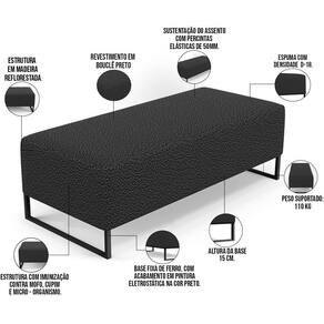 Pensando na praticidade do dia-dia, o Puff Decorativo Sala de Estar Bali W01 Base Ferro 120x50 cm Bouclê Preto - Lyam Decor se faz perfeito para a sua ambientação! É extremamente confortável, ideal para quem procura por funcionalidade e beleza embutidos num único produto. Estruturado com espuma macia e de alta densidade e revestimento de excelente qualidade, além de seus belos pés de metal que arrematam muito bem toda a composição deixando-o ainda mais elegante. Possuindo diferentes funções, pode ser posto em salas de estar, garantindo assentos extras, no quarto, como um apoio ou até mesmo recamier aos pés da cama, em closets, integrando ambientes, dentre outras maneiras.