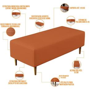 Pensando na praticidade do dia-dia, o Puff Decorativo Sala de Estar Bali W01 Pés Palito 120x50cm Tecido Terracota - Lyam Decor se faz perfeito para a sua ambientação!! É extremamente confortável, ideal para quem procura por funcionalidade e beleza embutidos num único produto. Estruturado com espuma macia e de alta densidade e revestimento de excelente qualidade, além de seus belos pés palito que arrematam muito bem toda a composição deixando-o ainda mais elegante.