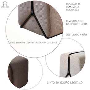 O puff Slim possui base em aço carbono, com pintura eletroestática de alta qualidade, podendo ser fosca ou cromada. Com cinto transpassado de couro nas opçoes preto ou marrom. Conta com espuma D-26 com manta siliconada para melhor acabamento. Tecido linho / de disponíveis em 4 cores e costurado a mão. Diferenciais que tornam esse produto único, leve e com longa durabilidade!