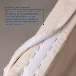 Pensado para a vida real: capas removíveis e laváveis, fixadas por fecho de contato. A estrutura interna é robusta: madeira maciça de eucalipto, percintas elásticas, mola bonnel e espuma D-26 no assento.