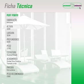 Puff Para área Externa Portugal Em Alumínio E Cordão Preto O Puff Portugal e extremamente charmoso, ele tem o visual que voce precisa para deixar seu lar mais bonito, ideal para decorar e servir como apoio de descanso. Fabricada totalmente em aluminio, o que garante durabilidade e leveza. A estrutura e protegida por uma pintura eletrostatica, que oferece alta resistencia a corrosao, tornando-o ideal para ambientes externos. O acabamento em Cordao de Fibra Sintetica e de alta qualidade, resistente ao sol e as intemperies, mantendo sua aparencia e funcionalidade mesmo apos exposicao ao ar livre. Com capacidade para suportar ate 120 kg, o Puff Portugal oferece conforto e praticidade, sendo perfeito para varandas, jardins ou areas de piscina.