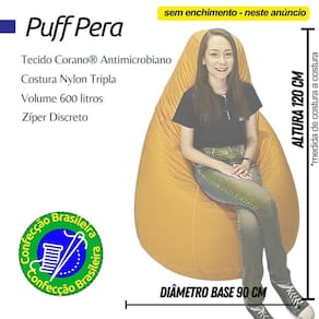 Capacidade Interna: Com uma capacidade de enchimento de 700 litros, o Puff Pera oferece espaço amplo para flocos de isopor, flocos de espuma ou uma combinação dos dois, proporcionando a você o controle total sobre o conforto desejado.