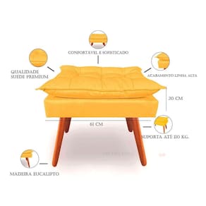 - altura: 52 cm; - largura: 46 cm; - profundidade: 62 cm. O que você está adquirindo: 01 unid. Puff opala com pés de madeira envernizado