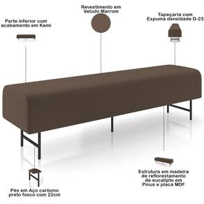 Cor: Marrom | OriginState: PR | Material: Espuma, Madeira, Aço | ColorSupplier: Marrom | ColorFamily: Marrom | ProductHeight: 46cm | Color: Marrom | Largura: 195 cm | ProductLength: 46cm | Com pés: Sim | ProductWidth: 195cm | ProductInstructions: Produto para uso residencial em ambiente interno, não devendo ficar exposto diretamente ao sol, calo | MaterialFamily: Espuma, Madeira, Aço | Altura: 46 cm | ColorSimple: Marrom | Forma: Retangular | Model: Novara | SupplierSimpleName: Puff Recamier Decorativo com Pés Industrial 195cm Novara P05 Veludo Marrom - Lyam Decor | ProductWeight: 14 kg | SizeDescription: Altura: 46cm x Largura: 195cm x Profundidade: 46cm | ProductContents: 01 Puff Recamier | ProductWarranty: 90 dias após o do produto. | OriginCountry: | É dobrável: Não | Desenho do tecido: Liso | Quantidade de pés: 5 | Peso máximo suportado: 120 kg | Formato de venda: Unitário