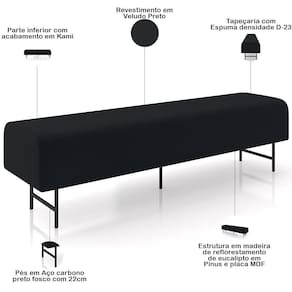 OriginState: PR | Material: Espuma, Madeira, Aço | Cor: Preto | ProductWidth: 195cm | ProductContents: 01 Puff Recamier | Peso máximo suportado: 120 kg | Formato de venda: Unitário | ColorSupplier: Preto | ColorSimple: Preto | Forma: Retangular | Color: Preto | ProductHeight: 46cm | Quantidade de pés: 5 | ProductWeight: 14 kg | MaterialFamily: Espuma, Madeira, Aço | Altura: 46 cm | ProductLength: 46cm | OriginCountry: | ProductInstructions: Produto para uso residencial em ambiente interno, não devendo ficar exposto diretamente ao sol, calo | É dobrável: Não | Largura: 195 cm | ColorFamily: Preto | Model: Novara | SizeDescription: Altura: 46cm x Largura: 195cm x Profundidade: 46cm | Desenho do tecido: Liso | SupplierSimpleName: Puff Recamier Decorativo com Pés Industrial 195cm Novara P05 Veludo Preto - Lyam Decor | ProductWarranty: 90 dias após o do produto. | Com pés: Sim