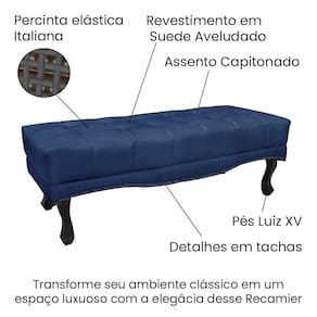 O Puff Recamier Vicenza de 140cm é uma peça de mobiliário elegante e funcional, projetada para adicionar um toque de sofisticação e conforto ao seu ambiente. Sua estrutura é construída com madeira de eucalipto reflorestada mdf, garantindo durabilidade e sustentabilidade ambiental. Os pés são feitos de madeira maciça no estilo Luís XV, proporcionando estabilidade e robustez à peça. A densidade da espuma, classificada como D26, assegura um suporte confortável para o usuário, ideal para momentos de relaxamento e descanso. O tecido em Suede em tom Azul Marinho confere um acabamento suave e luxuoso, adicionando um toque de requinte ao design. Contém detalhes refinados como as tachinhas em metal fumê na borda, no assento contém detalhes em capitonê onde o estofamento é marcado com fios grossos, costurados ao tecido, formando saliências geométricas, enquanto a presença de percinta elástica italiana assegura suporte adicional e durabilidade. Com uma capacidade de suportar até 120 kg, o Puff Recamier oferece conforto e segurança para diferentes usuários. Quanto ao uso, o Puff Recamier pode ser utilizado em diversos ambientes, desde o quarto como um elegante banco no pé da cama, até a sala de estar como um sofá auxiliar ou até mesmo em espaços comerciais, como recepções ou salas de espera, adicionando conforto e estilo onde quer que esteja. Seja como um elemento decorativo ou como um lugar para relaxar, este móvel é uma escolha versátil e elegante para qualquer ambiente.