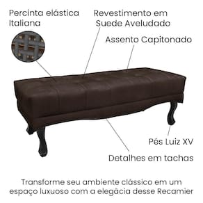 O Puff Recamier Vicenza de 160cm é uma peça de mobiliário elegante e funcional, projetada para adicionar um toque de sofisticação e conforto ao seu ambiente. Sua estrutura é construída com madeira de eucalipto reflorestada mdf, garantindo durabilidade e sustentabilidade ambiental. Os pés são feitos de madeira maciça no estilo Luís XV, proporcionando estabilidade e robustez à peça. A densidade da espuma, classificada como D26, assegura um suporte confortável para o usuário, ideal para momentos de relaxamento e descanso. O tecido em Suede em tom Café confere um acabamento suave e luxuoso, adicionando um toque de requinte ao design. Contém detalhes refinados como as tachinhas em metal fumê na borda, no assento contém detalhes em capitonê onde o estofamento é marcado com fios grossos, costurados ao tecido, formando saliências geométricas, enquanto a presença de percinta elástica italiana assegura suporte adicional e durabilidade. Com uma capacidade de suportar até 120 kg, o Puff Recamier oferece conforto e segurança para diferentes usuários. Quanto ao uso, o Puff Recamier pode ser utilizado em diversos ambientes, desde o quarto como um elegante banco no pé da cama, até a sala de estar como um sofá auxiliar ou até mesmo em espaços comerciais, como recepções ou salas de espera, adicionando conforto e estilo onde quer que esteja. Seja como um elemento decorativo ou como um lugar para relaxar, este móvel é uma escolha versátil e elegante para qualquer ambiente.