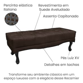 O Puff Recamier Retrô Vic foi desenvolvido para quem busca funcionalidade e elegância. Com 160cm de largura, ele é perfeito para complementar a decoração do quarto, sala ou hall de entrada, garantindo um toque de charme ao ambiente. Confeccionado em suede aveludado, proporciona um toque macio e aconchegante. O assento capitonado é preenchido com espuma D26, garantindo firmeza e durabilidade sem abrir mão do conforto. Os pés de madeira maciça estilo Luís XV oferecem um toque vintage e robustez ao móvel. Com detalhes impecáveis, como as tachinhas em metal fumê e a costura em matelassê, que reforçam a sofisticação do design e agregam personalidade e requinte à peça. Este móvel chegará em sua casa separado em 01 volume.