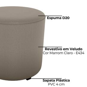 Puff Redondo Copenhage, muito conforto e estilo compacto! Estrutura em Madeira de Eucalipto (de reflorestamento) e MDF, estofado com espuma D20 e revestido em Veludo. O design redondo é valorizado pelo detalhe de costura vertical nas laterais, além das sapatas plásticas (PVC), suporta até 110 kg. Este produto será entregue em 01 volume.