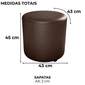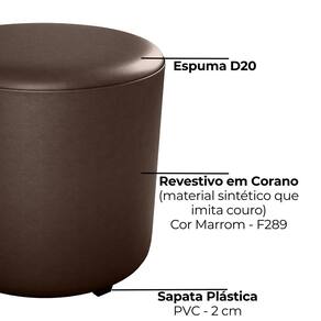 Puff Redondo Copenhage, muito conforto e estilo compacto! Estrutura em Madeira de Eucalipto (de reflorestamento) e MDF, estofado com espuma D20 e revestido em Corano (material sintético que imita couro). O design redondo é valorizado pelo detalhe de costura vertical nas laterais, além das sapatas plásticas (PVC), suporta até 110 kg. Este produto será entregue em 01 volume.