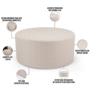 Características: Estrutura em madeira de reflorestamento de eucalipto. Revestimento em Bouclê de alta qualidade na cor Creme. Assento com espuma D-26 de alta resistência. Design orgânico para uso em diversos ambientes. Pés sapatas plásticas. Peso suportado: Até 120 kg.