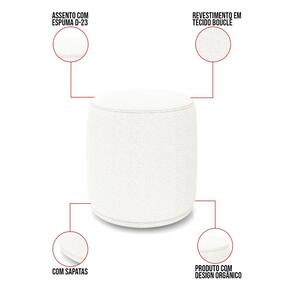 Quantos puffs você tem em casa? Nenhum? Então está na hora de mudar isso! Nada como chegar em casa, relaxar e ter um cantinho especial para esticar os pés, não é mesmo? Com o Puff Malu, não tem segredo, seus momentos de descanso serão garantidos. Além da sua simetria artística e curvas suaves, ele contém um revestimento em Bouclê que harmoniza com qualquer ambiente. Pode ser utilizado em sala de estar, recepções, escritórios, lojas, espaços comerciais, ou qualquer outro espaço que você queira decorar com estilo e bom gosto. Ele tem uma estrutura em madeira de reflorestamento eucalipto, que garante a resistência e a sustentabilidade do produto. Ele suporta até 120 kg de peso, podendo ser utilizada por pessoas de diferentes biotipos. Ele tem um acabamento reforçado e espuma de qualidade D23, que oferece maciez e aconchego. As sapatas plásticas (fixa) são pequenas proteções colocadas na base dos pés para evitar que eles risquem ou danifiquem o chão. O Puff Malu é um móvel de alta qualidade, que exala sofisticação e conforto. Ele é fácil de transportar, pois tem um peso leve e um tamanho compacto. Ele vai trazer charme, conforto incomparável e durabilidade para o seu ambiente. Corra e garanta seu Puff agora mesmo!