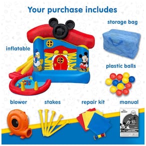 Leve para casa a divertida Disney Mickey Mouse Funhouse, oficialmente licenciada, para proporcionar horas de diversão em família e exercícios físicos para as crianças. Com alta qualidade na arte e produção, esta casa de salto inflável apresenta uma área de salto, escalada e deslizamento, cesta de basquete, poço de bolinhas e jogo de arremesso de argolas. O Mickey Mouse Funhouse vem com acessórios, incluindo soprador inflável com GFCI, estacas de soprador de ar, estacas infláveis, bolsa de armazenamento inflável, kit de reparo inflável, bolas de plástico e manual do proprietário. Com um forte soprador inflável, é possível inflar e esvaziar o Bouncer Slide em menos de um minuto Transporte e guarde em sua própria bolsa de armazenamento inflável e maleta de transporte.