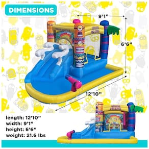 O Minions Bounce House com Slide é perfeito para manter as crianças ativas e entretidas. Ele conta com uma área de salto ideal para pulos e brincadeiras, além de um escorregador e uma área de escalada para desafios e descidas emocionantes. A cesta de basquete adiciona um toque esportivo, enquanto o sistema de nebulização de água proporciona uma refrescante brisa durante as brincadeiras. A piscina e o canhão de água são perfeitos para momentos de splash e diversão aquática. A área da piscina também pode ser transformada em uma piscina de bolinhas, tornando o inflável versátil para diferentes tipos de diversão.