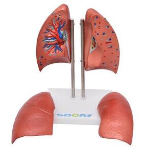 Modelo anatômico de Pulmões segmentado em 4 partes confeccionado em PVC, apresentado em tamanho natural e confeccionado em PVC; O modelo SD-5055/D mostra em ambos os pulmões:
