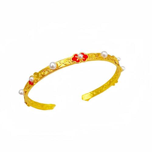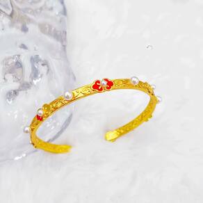 Peso: 13 g Material: Gold PlaceTema auspicioso “Tudo vai bem” — inspirada no motivo tradicional “”, esta pulseira simboliza paz, prosperidade e boa sorte na vida. Detalhes em esmalte e pérola — Decorado com vibrantes elementos florais de esmalte vermelho e enfeites de imitação de pérolas para um acabamento luxuoso e elegante. Técnica antiga de ouro na areia — Feita a partir de ouro de alta qualidade usando métodos tradicionais de ouro arenoso, oferecendo um brilho fosco refinado e uma textura duradoura. Manguito aberto confortável — A estrutura semirrígida e o design aberto garantem um ajuste flexível para a maioria dos tamanhos de pulso sem comprometer o impacto visual. Ideal para uso diário cerimonial ou elegante — Uma opção refinada para ocasiões formais ou integrada às roupas do dia a dia para transmitir estilo e profundidade cultural.