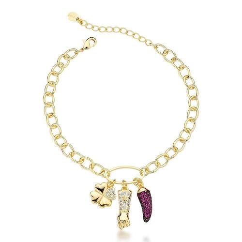 Pulseira Amuletos Da Fortuna Banhada Em Ouro 18k Com Pingentes Encantadores Pulseira Amuletos da Fortuna Banhada em Ouro 18k com Pingentes Encantadores 18cm - Pulseira Amuletos da Fortuna Banhada em Ouro 18k com Pingentes Encantadores Deslumbre-se com a elegância da Pulseira Amuletos da Fortuna, banhada a ouro 18k com zircônia cintilante. Este acessório fino carrega pingentes de amuletos da sorte: um trevo de quatro folhas com cristais, um olho grego e uma figa com zircônias fúcsia. A pulseira com amuleto promete não só um visual sofisticado, mas também atrair boas energias. Um brilho duradouro e uma riqueza de detalhes fazem desta pulseira uma peça preciosa em qualquer coleção.