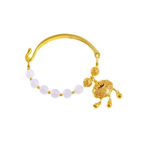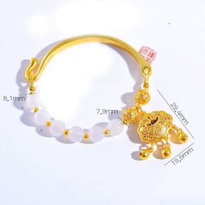 Tamanho: diâmetro do cordão de 8 mm, pingente de 20 x 30 mm Material: placa dourada Feita de placer dourado e ágata — esta pulseira combina placer dourado de alto brilho com contas lisas de ágata branca, oferecendo uma textura refinada e um contraste vibrante. Design Auspicious Lock Charm — apresenta um pingente delicadamente esculpido no formato de um cadeado tradicional da boa sorte, simbolizando proteção, longevidade e paz. Miçangas naturais de 8 mm + pingente de 20 x 30 mm — as miçangas são uniformemente amarradas e polidas, combinadas com um pingente dourado proeminente para uma aparência equilibrada e um ajuste confortável no pulso. Estrutura de meia pulseira com fecho de gancho — O design combina um arco dourado rígido com uma seção flexível de contas, presa por um fecho lateral para facilitar o uso. Expressão cultural e artística — Combinando motivos tradicionais chineses com artesanato moderno montado à mão, ideal para mulheres que buscam acessórios significativos e elegantes.