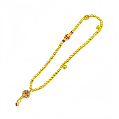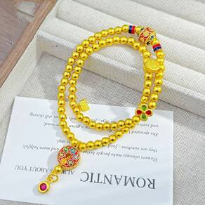 Material: Gold Placer Double Wrap Beaded Design — apresenta duas fileiras de miçangas douradas finamente polidas, criando uma aparência em camadas que adiciona volume e elegância. Amuleto de mantra de seis caracteres — Inclui um pingente central gravado com o clássico mantra tibetano “Om Mani Padme Hum”, representando paz e compaixão. Detalhes coloridos em esmalte — Detalhados com destaques de esmalte vermelho, verde e azul para uma aparência espiritual vibrante e equilibrada. Ajuste flexível e leve — Feita pensando no conforto, a pulseira oferece um toque macio ao redor do pulso, ideal para uso prolongado. Visão moderna da tradição — combina elementos budistas com uma estrutura elegante e minimalista, adequada para mulheres espirituais que buscam elegância cultural.
