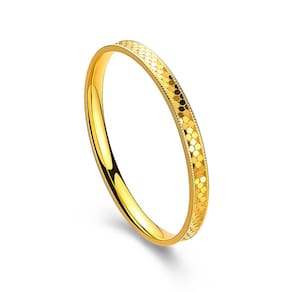 Tamanho: 58# Material: Gold Placer Feita a partir de ouro premium — Feita com revestimento de areia dourada de alta pureza, esta pulseira oferece um tom dourado vívido com excelente durabilidade e uma superfície interna polida. Padrão CNC Dragon Scale — Apresenta um motivo de escama de dragão com textura de pontos sem costura produzido por meio de corte CNC de precisão, proporcionando uma superfície cintilante com definição nítida. Acabamento polido altamente refletivo — A superfície que capta a luz cria um efeito espelhado deslumbrante de todos os ângulos, tornando-a uma declaração de estilo sob luz natural e artificial. Design clássico de pulseira redonda — o tamanho 58 # com uma estrutura elegante e fechada garante conforto e versatilidade, ideal para usar sozinho ou combinar com outros estilos minimalistas. Apelo moderno e sofisticado — Um estilo popular entre mulheres modernas, esta pulseira une a influência do padrão tradicional com um acabamento moderno de alto brilho.