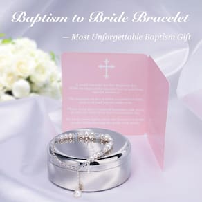 Pulseira de cruz de batismo em prata esterlina e pérolas cultivadas para bebês, com caixa de joias banhada a prata, ótimos presentes de batismo e batismo católicos para meninas - Mais do que uma pulseira de batismo – Uma lembrança única para ela em cada momento especial. Ela pode usá-la para sua cerimônia batismal e primeiro dia de comunhão. Também pode ser usada novamente como "algo antigo" quando ela se tornar uma noiva. - Her Future Heirloom - A caixa de lembrança de prata armazenará a pulseira de pérolas com segurança por décadas para que sua memória estimada possa ser transmitida de geração em geração. Um presente essencial para neta, afilhada e sobrinha de padrinhos, avós e tia. - Presente de batismo inesquecível: esta pulseira de prata esterlina com pérolas cultivadas tem um extensor que cabe em pulsos de até 20 cm. Ela também vem com uma caixa de joias clássica banhada a prata gravada em cruz como lembrança do dia do batismo. - Pronto para presentear – Este presente de batizado católico exclusivo para bebês inclui uma caixa de presente elegante e um cartão de poema na embalagem, sem necessidade de embrulho para presente. - Segurança sem preocupações - Todas as nossas joias para bebês e crianças atendem aos padrões de segurança para produtos infantis. Os componentes são livres de cádmio, BPA, PVS, ftalato e grafite.