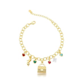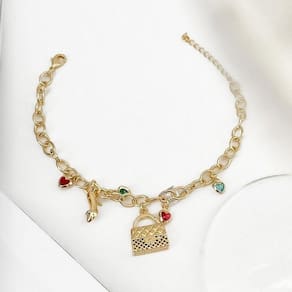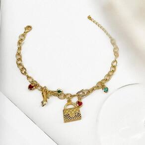 Pulseira Bolsa E Sapato Banhado A Ouro 18k Pulseira Bolsa e Sapato Banhado a Ouro 18k 18cm - A pulseira banhada a ouro 18k é a escolha perfeita para mulheres que adoram moda. Com pingentes de bolsa e sapato, adornados por zircônias coloridas, ela é uma homenagem à feminilidade e ao estilo. Este acessório une elegância e tendência, ideal para quem busca uma peça sofisticada e com um brilho especial. É um presente encantador ou uma adição luxuosa para qualquer coleção de joias. A pulseira é um símbolo de paixão pela moda, prometendo ser um destaque no pulso de qualquer mulher.
